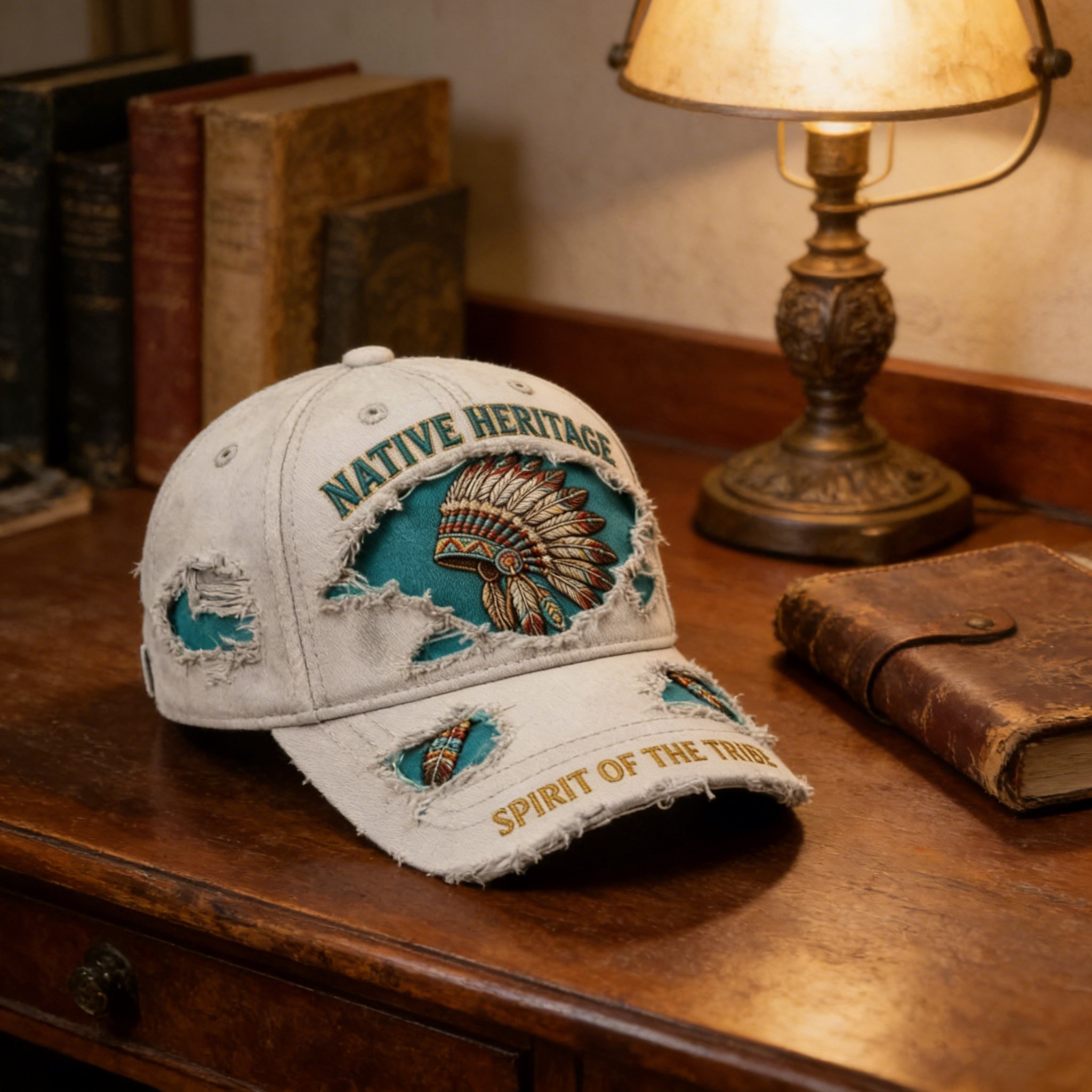 **Inscribed Spiritual Mottos:** The crown of the cap is embroidered with the phrase "NATIVE HERITAGE," while the brim bears the inscription "SPIRIT OF THE TRIBE." Rendered in gold lettering that stands out vividly against the distressed fabric, these phrases serve as a bold declaration of pride in—and a commitment to the preservation of—indigenous culture.